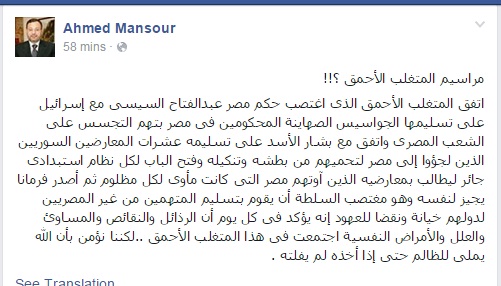 وقال منصور في تدوينة عبر صفحته على موقع التواصل الاجتماعي "فيس بوك": "اتفق المتغلب الأحمق، الذي اغتصب حكم مصر عبدالفتاح السيسي مع إسرائيل، على تسليمها الجواسيس الصهاينة المحكومين في مصر، بتهم التجسس على الشعب المصري، واتفق مع بشار الأسد على تسليمه عشرات المعارضين السوريين، الذين لجؤوا إلى مصر لتحميهم من بطشه وتنكيله".
