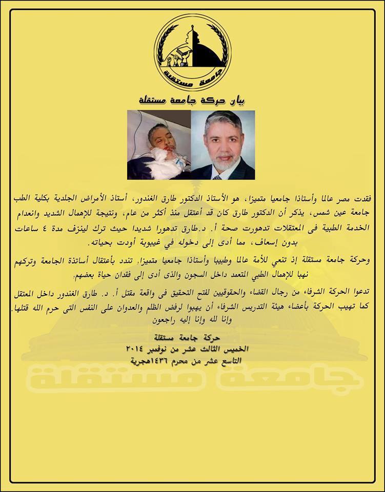 نعت حركة "جامعة مستقلة" وفاة الدكتور طارق الغندور، أستاذ الأمراض الجلدية بكلية الطب جامعة عين شمس، في سجون الانقلاب.
