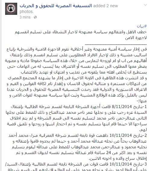 استنكرت التنسيقية المصرية للحقوق والحريات السياسة الأمنية الممنهجة وغير الأخلاقية التى تقوم الأجهزة الأمنية والشرطية بإتباع أساليب مشينة و ذلك لإجبار الافراد المطلوبين على تسليم انفسم وذلك بإعتقال أهاليهم من اب او ام اوزوجة لتمارس من خلال هذه السياسة ضغوطا مادية و معنوية يضطر معها المطلوب الى تسليم نفسه أو الاعتراف بما يُنسب له من اتهامات حتى يستطيع ان يُخلص اهله مما يلقونه من تعذيب و امتهان او تهديد بالاغتصاب .