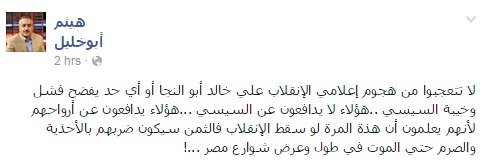 وقال أبوخليل في تدوينة عبر صفحته على موقع التواصل الاجتماعي "فيس بوك": "لا تتعجبوا من هجوم إعلامي الانقلاب على خالد أبوالنجا، أو أي حد يفضح فشل وخيبة السيسي، هؤلاء يدافعون عن أرواحهم، لأنهم يعلمون أن هذة المرة لو سقط الانقلاب، فالثمن سيكون ضربهم بالأحذية والصرم حتي الموت، في طول وعرض شوارع مصر!".