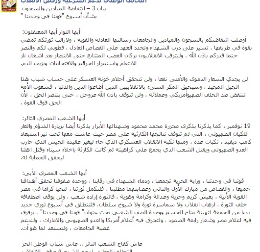 وأضاف البيان: "أيها الشعب المصري الأبي قوتنا في وحدتنا، وراية الحرية تجمعنا، ودماء الشهداء في رقابنا، ووحدة صفوفنا تحقق أهدافنا جميعا، والقصاص من مبارك الأول والثاني وعصابتهما مطلبنا، فلنكمل ثورتنا، لنحيا كراما في مصر القوية الأبية، بعيش كريم وحرية وعدالة وكرامة وهوية، فالثورة إرادة شعب، ولن يوقف اصطفافه خلف الثورة، إرهاب انقلاب، ولا سماسرة ثورة، ولا شيوخ سلطان".