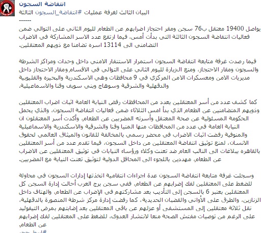 وقالت اللجنة العليا لانتفاضة السجون: إن "19400 معتقل بـ 76 سجن ومقر احتجاز يواصلون إضرابهم عن الطعام لليوم الثاني على التوالي، ضمن فعاليات انتفاضة السجون الثالثة التي بدأت أمس، فيما ارتفع عدد الأسر المشاركة في الإضراب التضامني إلى 13114 أسرة تضامنا مع ذويهم المعتقلين".
