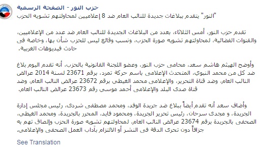أكد حزب النور إنه تقدم أمس الثلاثاء، بعدد من البلاغات الجديدة للنائب العام ضد عدد من الإعلاميين، والقنوات الفضائية، لمحاولتهم تشويه صورة الحزب، ونسب وقائع ليس للحزب شأن بها، وخاصة فى حادث فيديوهات الغربية، بحسب بيان نشر على الصفحة الرسمية للحزب عبر موقع التواصل الاجتماعي "فيس بوك.