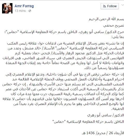 وشدد أبو زهري، أن حركة حماس "تذكر بالتصريحات الرسمية التي أكدت استبعاد حركة حماس عن الأحداث في مصر، كما أكدت الحركة أن اتصالات رسمية رفيعة المستوى جرت معها عدة مرات كان آخرها يوم أمس، أكد المسئولون المصريون خلالها على قناعتهم بأن حماس لا علاقة لها بالوضع المصري الداخلي، وهو ما يجزم بأن الإعلام المصري يغرد بعيداً عن الحقيقة".