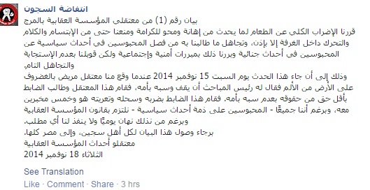 وأضاف البيان: "يوم السبت 15 نوفمبر 2014 وقع منا معتقل مريض بالغضروف على الأرض من الألم، فقال له رئيس المباحث أن يقف وسبه بأمه، فقام هذا المعتقل وطالب الضابط بأقل حق من حقوقه بعدم سبه بأمه. فقام هذا الضابط بضربه وسحله وتعريته هو وخمس مخبرين معه، وبرغم أننا جميعًا – المحبوسين على ذمة أحداث سياسية – نلتزم بقانون المؤسسة العقابية وبرغم ذلك نهان يوميًا، ولا ينفذ لنا أي مطلب".