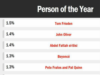 تراجع عبدالفتاح السيسي قائد الانقلاب العسكري 6 مراكز في تصويت قراء مجلة "تايم" الأمريكية، مساء الخميس، ليحتل المرتبة الـ31،من بين 50 شخصية، حيث تجرى مجلة التايم كل عام استفتاءا لاختيار شخصية العام.