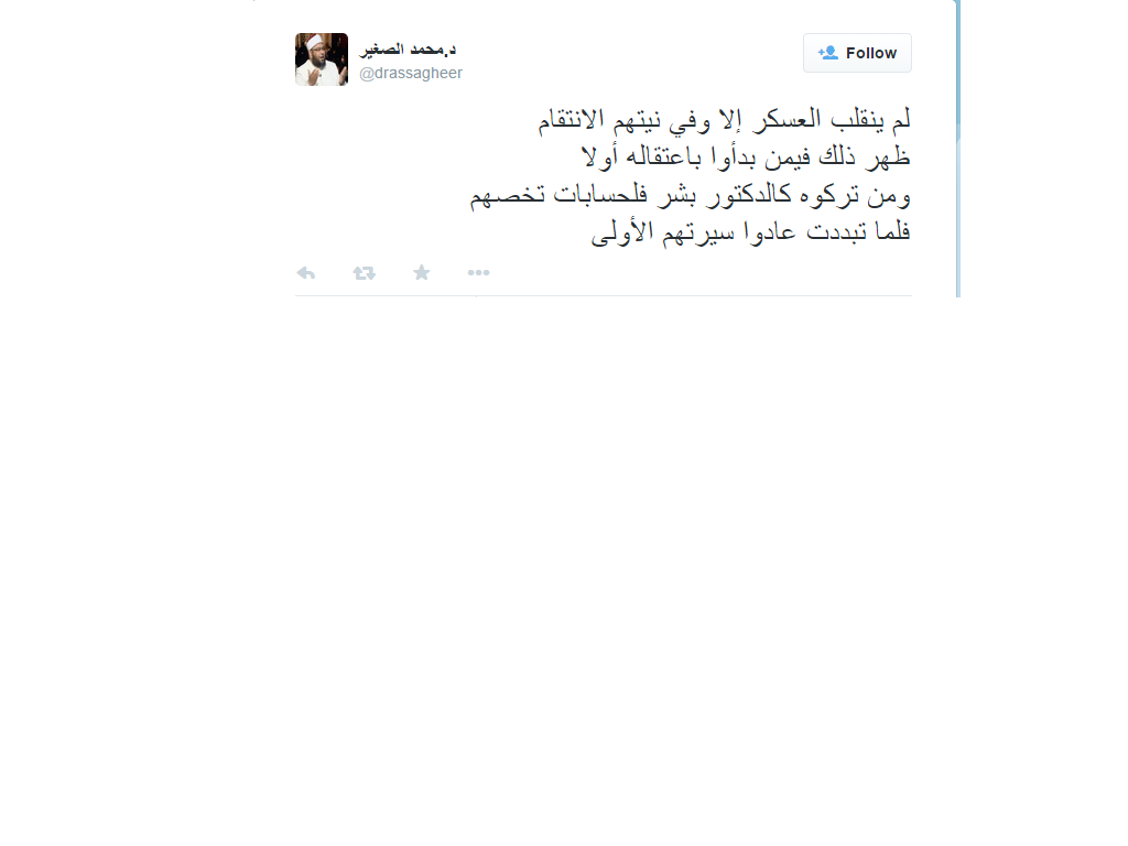 وأضاف الصغير -في تغريدات له عبر موقع التواصل الاجتماعي "تويتر": "بعض الشيوخ صمتوا عن الانقلاب العسكري ولم يناقشهم أحد في خيارهم ثم أعلنوا أن انتفاضة الشباب المسلم، ﻻ تجوز وكأن الممنوع هو تظاهر المسلمين فقط".