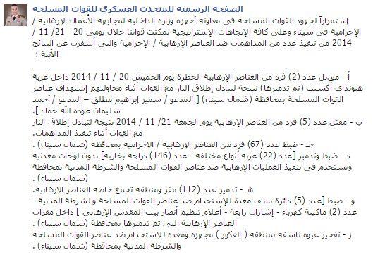 وقال العميد محمد سمير، المتحدث العسكري لقوات المسلحة، في بيان عبر صفحته بموقع التواصل الاجتماعي "فيس بوك" اليوم،:" أن عناصر من الجيش تمكنت، خلال يومي الخميس والجمعة الماضيين، من قتل 7 من العناصر الإرهابية (منهم 2 يوم الخميس، و5 يوم الجمعة) نتيجة تبادل إطلاق النيران مع القوات، بـ(محافظة) شمال سيناء (شمال شرقي البلاد)".