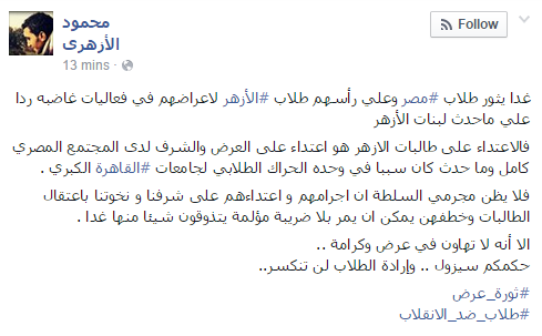 حيث قال في منشور له على موقع التواصل الاجتماعي "فيس بوك": "الاعتداء على طالبات الأزهر هو اعتداء على العرض والشرف لدى المجتمع المصري كامل، وما حدث كان سببًا في وحدة الحراك الطلابي لجامعات القاهرة الكبري". .
