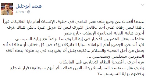 طالب هيثم أبو خليل، الناشط الحقوقي، ومدير مركز ضحايا لحقوق الإنسان، الجالية المصرية في إيطاليا، وفرنسا، بفضح النظام الانقلابي في الفاتيكان، تزامناً مع زيارة عبدالفتاح السيسي، قائد الانقلاب العسكري.