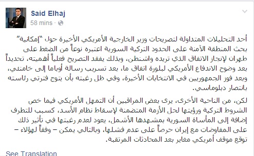 وأضاف الباحث السياسي: "لكن من الناحية الأخرى، يرى بعض المراقبين أن التمهل الأمريكي فيما خص الشروط التركية ورؤيتها لحل الأزمة المتضمنة لإسقاط نظام الأسد، كسبب للتطرف إضافة إلى المأساة السورية بمشهدها الأشمل، يعود لعدم رغبتها في تأثير ذلك على المفاوضات مع إيران حرصاً على عدم فشلها، وبالتالي يمكن – وفقاً لهؤلاء – توقع موقف أمريكي مغاير بعد المحادثات المرتقبة".