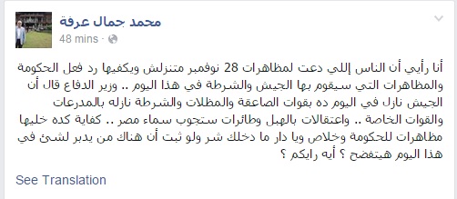 وقال "عرفة" في تدوينة عبر صفحته على موقع التواصل الاجتماعى "فيس بوك": "أنا رأيي أن الناس اللي دعت لمظاهرات 28 نوفمبر متنزلش، ويكفيها رد فعل الحكومة، والمظاهرات التي سيقوم بها الجيش والشرطة في هذا اليوم".