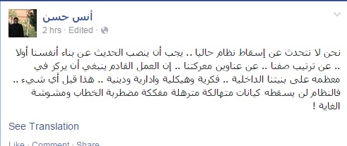 وقال "حسن" في تدوينة عبر صفحته على موقع التواصل الاجتماعي "فيس بوك": "نحن لا نتحدث عن إسقاط نظام حاليا.. يجب أن ينصب الحديث عن بناء أنفسنا أولا.. عن ترتيب صفنا.. عن عناوين معركتنا".