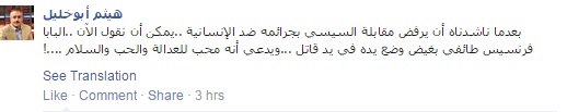 وقال أبوخليل في تدوينه عبر صفحته على موقع التواصل الاجتماعي "فيس بوك": "بعدما ناشدناه أن يرفض مقابلة السيسي بجرائمه ضد الإنسانية.. يمكن أن نقول الآن.. البابا فرنسيس طائفي بغيض وضع يده في يد قاتل، ويدعي أنه محب للعدالة والحب والسلام!".
