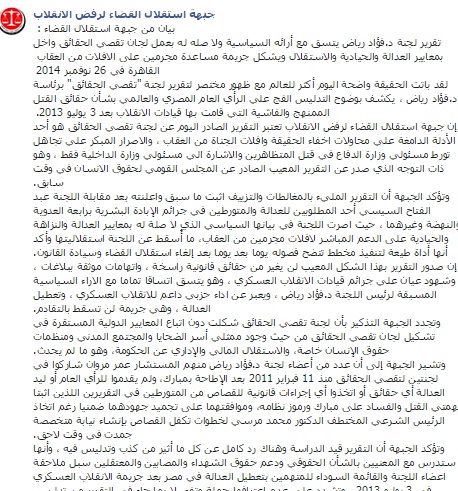 أكدت جبهة استقلال القضاء لرفض الانقلاب، أن تقرير لجنة الدكتور فؤاد رياض، يتسق مع أرائه السياسية، ولا صله له بعمل لجان تقصي الحقائق، وأخل بمعايير العدالة والحيادية والاستقلال، ويشكل جريمة مساعدة مجرمين على الإفلات من العقاب.