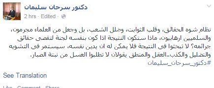 وقال سليمان في تدوينة عبر صفحته على موقع التواصل الاجتماعي "فيس بوك": "نظام شوه الحقائق، وقلب الثوابت، وضلل الشعب، بل وجعل من العلماء مجرمون، والسلميين إرهابيون، ماذا ستكون النتيجة إذا كون بنفسه لجنة لتقصي حقائق جرائمه؟".