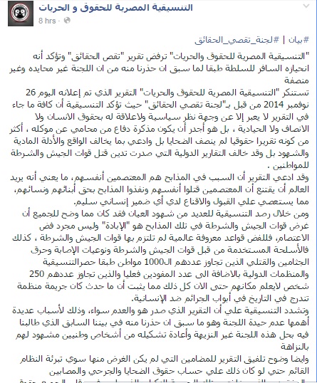 واعتبرت "التنسيقية المصرية" في بيان عبر صفحتها على موقع التواصل الاجتماعي "فيس بوك" أن ما جاء في التقرير الذي تم إعلانه يوم 26 نوفمبر 2014 من قبل لجنة تقصي الحقائق، "لا يعبر إلا عن وجهة نظر سياسية، ولاعلاقة له بحقوق الإنسان ولا الإنصاف ولا الحيادية، بل هو أجدر أن يكون مذكرة دفاع من محامي عن موكله، أكثر من كونه تقريرًا حقوقيًا لم ينصف الضحايا، بل وادعي بما يخالف الواقع والأدلة المادية والشهود، بل وقد خالف التقارير الدولية التي صدرت تدين قتل قوات الجيش والشرطة للمواطنين".