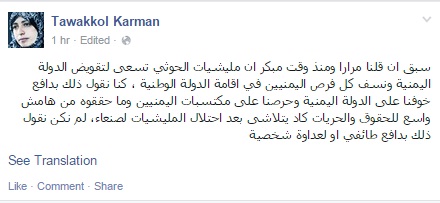 أكدت الناشطة اليمنية، توكل كرمان، أن مهاجمتها لقوات الحوثيين لم تكن "بدافع طائفي، أو لعداوة شخصية".