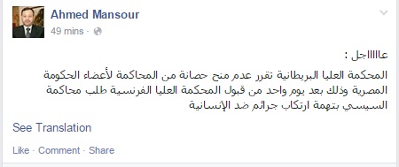 وقال منصور في تدوينة عبر صفحته على موقع التواصل الاجتماعي "فيس بوك": "المحكمة العليا البريطانية تقرر عدم منح حصانة من المحاكمة لأعضاء الحكومة المصرية، وذلك بعد يوم واحد من قبول المحكمة العليا الفرنسية، طلب محاكمة السيسي بتهمة ارتكاب جرائم ضد الإنسانية".
