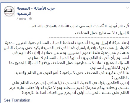 أكد حاتم أبو زيد، المتحدث الرسمي لحزب الأصالة، والقيادي بالتحالف الوطنى لدعم الشرعية، أن ادعاء حركة 6 إبريل وغيرها، أن عنوان انتفاضة الشباب المسلم دعوة للتفريق، "دعوة كاذبة، بل هي دعوة توافقية بامتياز"، حسب وصفه.