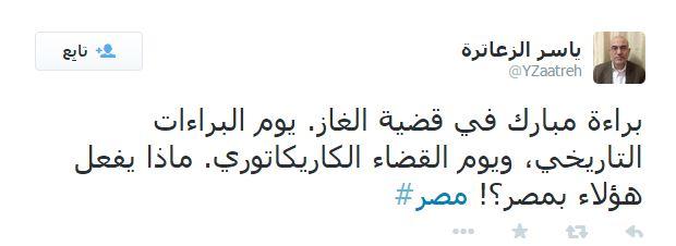 وتساءل الزعاترة، في تغريدة له على موقع التواصل الاجتماعي "تويتر": "براءة مبارك في قضية الغاز. يوم البراءات التاريخي، ويوم القضاء الكاريكاتوري. ماذا يفعل هؤلاء بمصر؟! ".