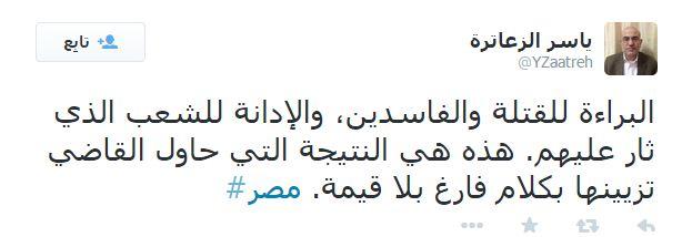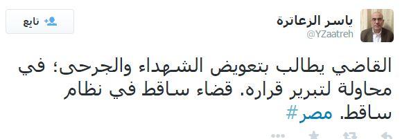 وتابع الزعاترة :"البراءة للقتلة والفاسدين، والإدانة للشعب الذي ثار عليهم. هذه هي النتيجة التي حاول القاضي تزيينها بكلام فارغ بلا قيمة"، مضيفا :"القاضي يطالب بتعويض الشهداء والجرحى؛ في محاولة لتبرير قراره. قضاء ساقط في نظام ساقط".