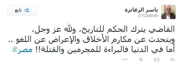 وأضاف :"القاضي يترك الحكم للتاريخ، ولله عز وجل، ويتحدث عن مكارم الأخلاق والإعراض عن اللغو .. أما في الدنيا فالبراءة للمجرمين والقتلة!! "