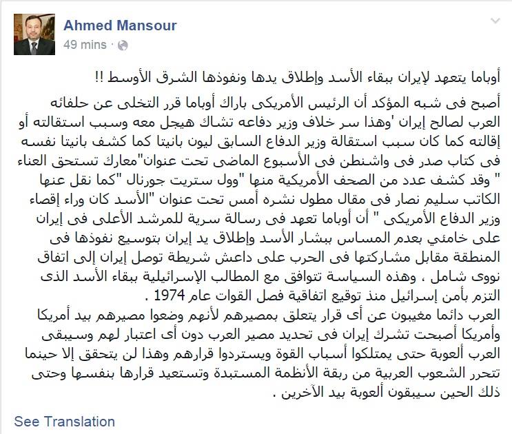 وقال منصور في تدوينة عبر صفحته على موقع التواصل الاجتماعي "فيس بوك": "أصبح في شبه المؤكد أن الرئيس الأمريكي باراك أوباما، قرر التخلى عن حلفائه العرب لصالح إيران، وهذا سر خلاف وزير دفاعه تشاك هيجل معه، وسبب استقالته أو إقالته، كما كان سبب استقالة وزير الدفاع السابق ليون بانيتا، كما كشف بانيتا نفسه فى كتاب صدر فى واشنطن فى الأسبوع الماضي تحت عنوان (معارك تستحق العناء)".