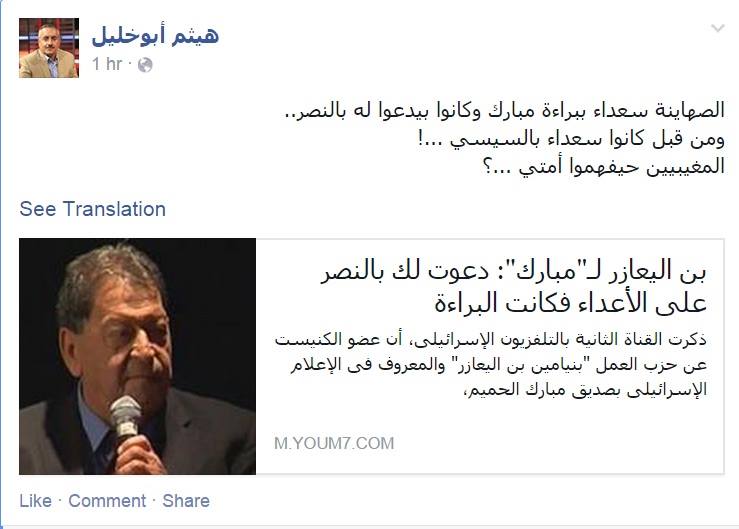 وقال أبو خليل في تدوينة عبر صفحته على موقع التواصل الاجتماعي "فيس بوك": "الصهاينة سعداء ببراءة مبارك وكانوا بيدعوا له بالنصر، ومن قبل كانوا سعداء بالسيسي!"، متسائلا: "المغيبين حيفهموا امتى؟".