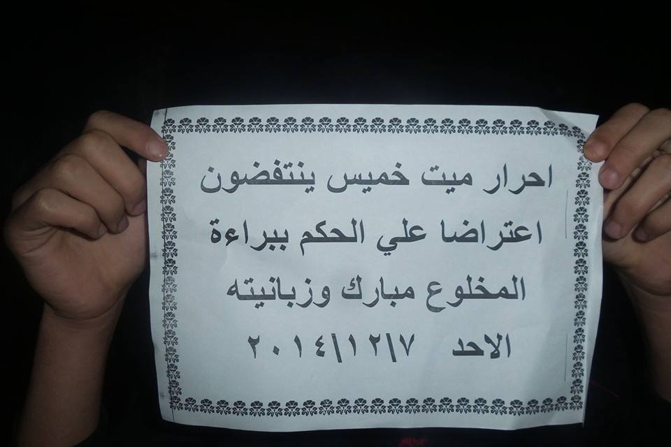 وفي قرية "ميت خميس"، نظم الأهالي وقفة احتجاجية تنديدًا ببراءة مبارك، وأخرى مناوئة لقضاء الانقلاب، حمل المشاركون فيها شارات رابعة، وأعلام مصر، كما أكدوا على استمرارهم في التظاهر السلمي، حتى إسقاط الانقلاب.
