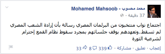 وأضاف محسوب خلال تدوينة له على موقع التواصل الإجتماعي "فيس بوك" أن تعهد أعضاء البرلمان الشرعي بوقف جلساتهم بمجرد سقوط نظام القمع إحترام لشرعية الثورة.