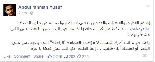 وكتب في تدوينة عبر صفحته على موقع"فيس بوك": "إعلام الغوازي والعاهرات والقوادين يدّعي أن الإنتربول سيقبض على الشيخ ‫#‏القرضاوي… والنكتة من كتر سخافتها لا تستحق الرد.. بس أنا هرد على اللي مشغلينهم".