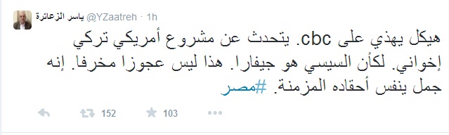 وقال"الزعاترة" خلال تغريدة له عبر حسابه على موقع"تويتر": "هيكل يهذي على cbc، يتحدث عن مشروع أمريكي تركي إخواني، كأن السيسي هو جيفارا..هذا ليس عجوزًا مخرفًا.. إنه جمل ينفس أحقاده المزمنة. #مصر".