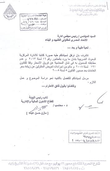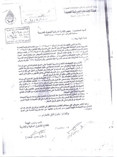 يذكر أن المهندس داكر عبد اللاه عضو اتحاد مقاولي التشيييد والبناء كان قد أثار مؤخرة مشكلة المنشور رقم 16 لسنة 2013 الصادر عن الادارة المركزية للبحوث الضريبية الذي يقضي بتحصيل ضريبة عن تعويضات المقاولين عن فروق اسعار الخامات  وعدم قانونية ذلك.
