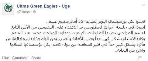 أعلنت رابطة مشجعي النادي المصري "جرين إيجلز" أنه تم الاعتداء على المتهمين في القضية المعروفه إعلاميًا بـ"استاد بورسعيد" من قبل الأمن التابع لقسم شرطة الضواحي وضابط يدعى حسام عزت، ومحمد المنعم، معاون المباحث بالقسم.