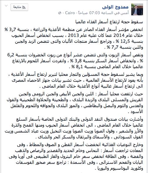 الولي رصد عبر صفحته الشخصية علي موقع التواصل الاجتماعي الفيسبوك أن تراجع مؤشر أسعار الغذاء الصادر عن منظمة الأغذية والزراعة، بنسبة 7.3% خلال عام 2014 عما كان عليه عام 2013، بسبب انخفاض أسعار الحبوب بنسبة 12.5%، وتراجع أسعار منتجات الألبان والتى تتضمن الزبد والجبن واللبن بنسبة 7.7%.