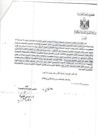 أصدرت النقابة العامة للعاملين بالشركة المصرية لنقل الكهرباء، برئاسة خالد أبو زيد بيانا رسميا منذ قليل أكدت من خلاله أنها نقابة مستقلة شرعية طبقا للدستور المصري والاتفاقيات الدولية التي وقعت عليها مصر.