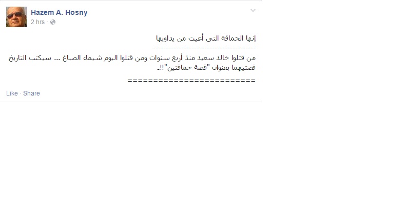 وكتب خلال تدوينة له عبر صفحته على موقع"فيس بوك":"إنها الحماقة التى أعيت من يداويها..من قتلوا خالد سعيد منذ 4 سنوات ومن قتلوا اليوم شيماء الصباغ".