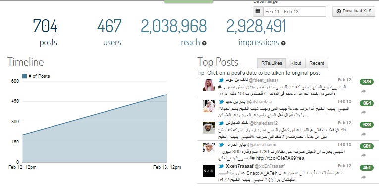 دشنت قناة “مكملين” وعدد من النشطاء بالأمس هاشتاج “السيسي ينهب الخليج” ، وقد احتل الهاشتاج الصدارة عالميًا في وقت ضئيل، إذ تفاعل معه على مدار يوم فقط نحو2.928.491 عبر مواقع التواصل الاجتماعي.