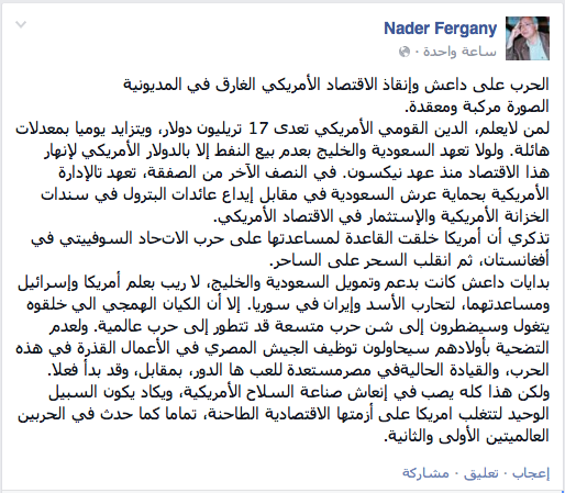 واختتم تدوينته قائلًا: هذا كله يصب في إنعاش صناعة السلاح الأمريكية، ويكاد يكون السبيل الوحيد لتتغلب امريكا على أزمتها الاقتصادية الطاحنة، تماما كما حدث في الحربين العالميتين الأولى والثانية.