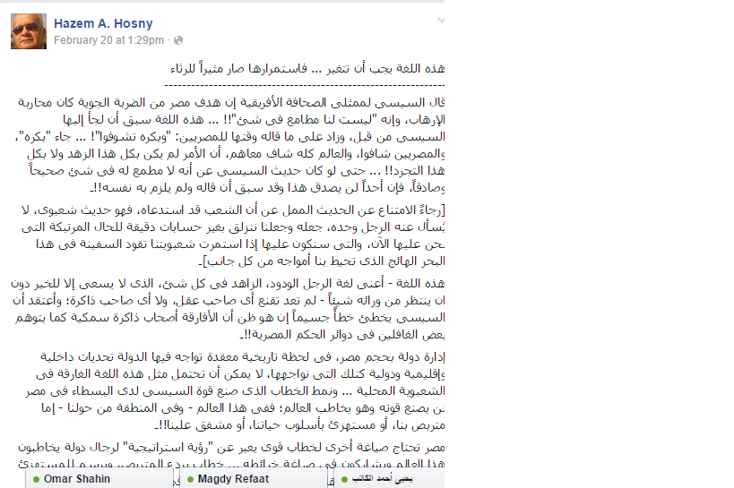 انتقد الكاتب الصحفي، حازم حسني، تبرير عبدالفتاح السيسي (قائد الانقلاب العسكري)، للضربة الجوية في ليبيا، حينما قال لممثلي الصحافة الإفريقية، إن هدف مصر من الضربة الجوية، هو محاربة الإرهاب، نافيًا أن تكون ثمة مطامع أخرى.