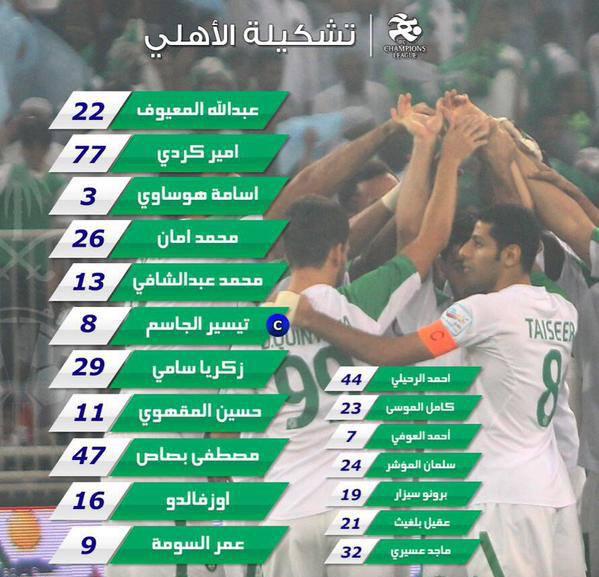 وتبدأ المباراة الساعة الـ 18:25 بتوقيت مصر ، حيث أعلنت تشكيلة فريق الأهلي السعودي كالتالي :