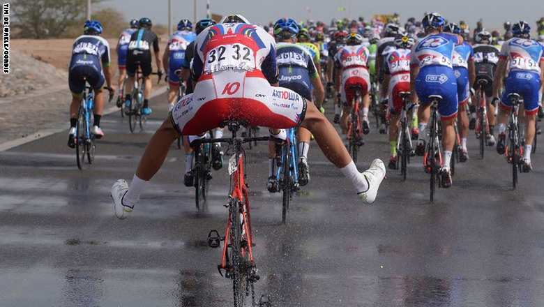9 – راكب الدراجات الهوائية الإيطالي، جاكوبو غوارنيني يقفز في بركة مياه خلال المرحلة السادسة من دوري عمان للداراجات الهوائية في 22 فبراير.