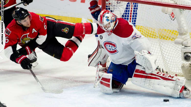 10 – حارس مرمى فريق مونتريال كانيديانز، داستن توكراسكي، يلتقط ضربة من خصمه بوبي رايان من فريق أوتوا، خلال دورة ألعاب الهوكي الوطنية المقامة في أوتوا بتاريخ 18 فبراير.