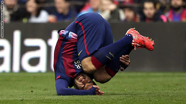 2 – لاعب فريق برشلونة لكرة القدم، لويس سواريز، يسقط أرضاً في مباراة بالدوري الإسباني ضد فريق مالاغا ببرشلونة، الذي غلب الفريق المستضيف بهدف مقابل لا شيء.