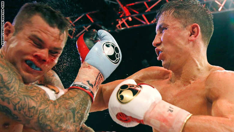 3 – بطل الملاكمة من فئة الوزن المتوسط، غينادي غولوفكين (اليمين) يوجه لكمة لخصمه مارتن موراي في مباراة للفوز باللقب التي أقيمت في مونتي كارلو بموناكو يوم السبت، 22 فبراير وفاز غولوفكين في الجولة 11 ليستعيد اللقب وتاريخه الخالي من الهزائم.