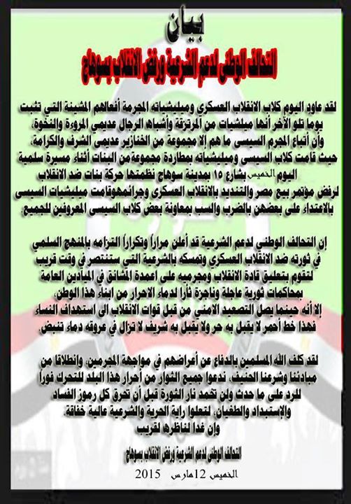 ندد التحالف الوطني لدعم الشرعية بسوهاج بما وقع من قوات الأمن بمطاردة مجموعة من البنات أثناء مسيرة سلمية اليوم الخميس بشارع 15 بمدينة سوهاج، نظمتها حركة بنات ضد الانقلاب، لرفض مؤتمر بيع مصر والتنديد بالانقلاب العسكري، مشيرا إلى أن القوات اعتدت على بعض الفتيات بالضرب والسب، بمعاونة "بعض كلاب السيسى" المعروفين للجميع- بحسب بيان.