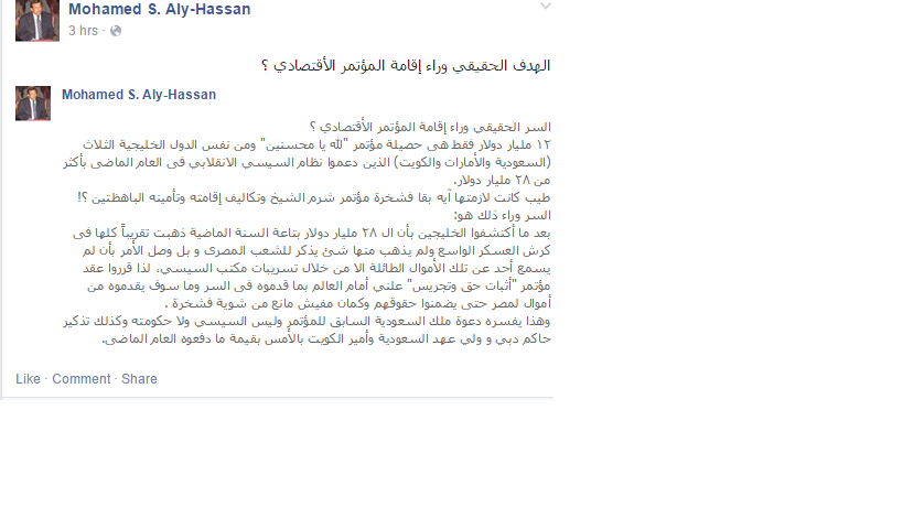 ودلل حسن على كلامه بما أسماه دعوة ملك السعودية السابق للمؤتمر وليس السيسي ولا حكومته، وكذلك تذكير حاكم دبي وولي عهد السعودية وأمير الكويت أمس بقيمة ما دفعوه العام الماضي.