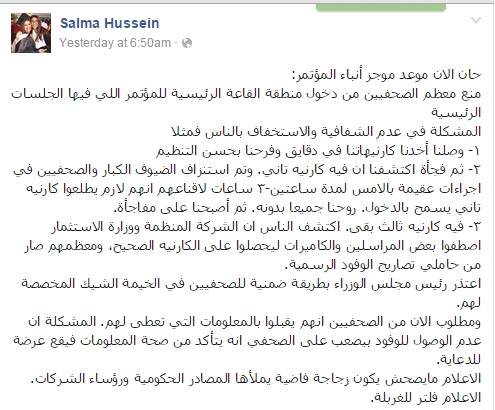 وقالت، في تدوينة لها عبر صفحتها على موقع التواصل الاجتماعي "فيس بوك": "تم منع معظم الصحفيين من دخول منطقة القاعة الرئيسية للمؤتمر اللي فيها الجلسات الرئيسية، المشكلة في عدم الشفافية والاستخفاف بالناس، فمثلا، وصلنا وأخدنا كارنيهاتنا في دقايق وفرحنا بحسن التنظيم، ثم فجأة اكتشفنا إن فيه كارنيه تاني، وتم استنزاف الضيوف الكبار والصحفيين في إجراءات عقيمة بالأمس لمدة ساعتين أو 3 ساعات، لإقناعهم إنهم لازم يطلّعوا كارنيه تاني يسمح بالدخول، روحنا جميعا دونه، ثم أصبحنا على مفاجأة".