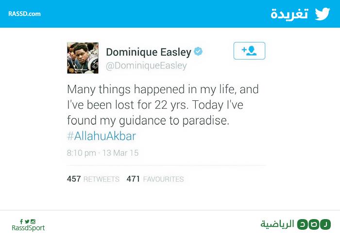 أعلن دومينيك إيسلي، لاعب كرة القدم الأمريكية الشهير، صاحب الـ22 عامًا، إسلامه عبر حسابه الشخصي على موقع التواصل الاجتماعي "تويتر".